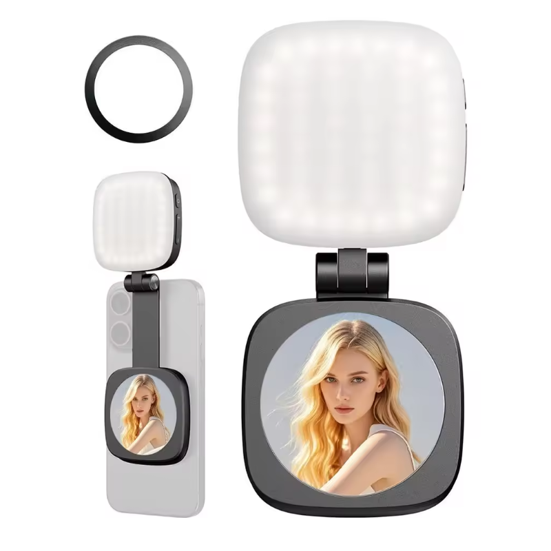 – Featuring a built-in mini dual-axis head, this light enables 360° pan and 270° tilt adjustments, ensuring complete 360° fill light coverage. Compact and lightweight, it’s akin to a women’s powder compact, making it effortlessly portable. The built-in glass mirror instantly transforms the unit into a handy makeup mirror!