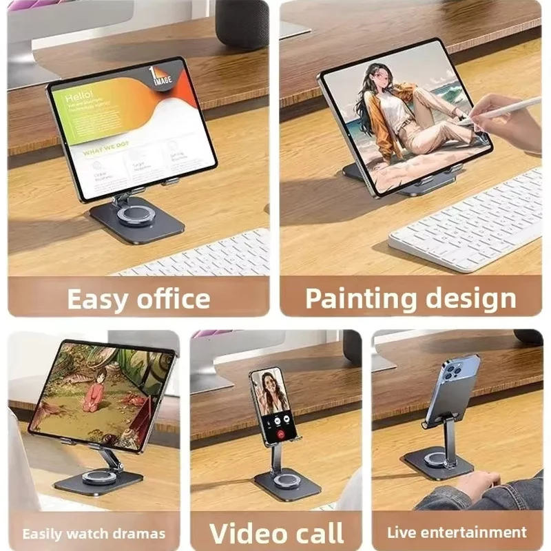 • Multifunctional Design: This rotating metal phone stand offers a multifunctional design, perfect for various uses such as watching videos, taking hands-free calls, and browsing the internet.